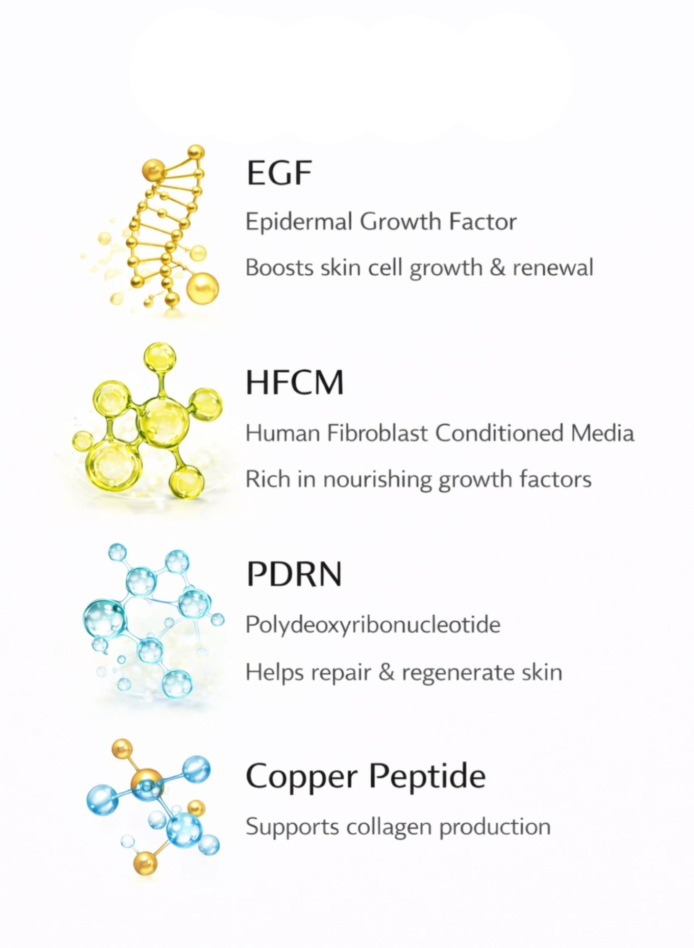 Most serums focus on just one or two active ingredients. High-end ingredients like EGF, HFCM, PDRN, and Copper Peptides are usually found in separate products, which can become expensive when purchased individually. We combined these advanced biotech ingredients into one powerful formula. Instead of layering multiple serums, you get a complete anti-aging solution in a single bottle — offered at $52 for exceptional value.