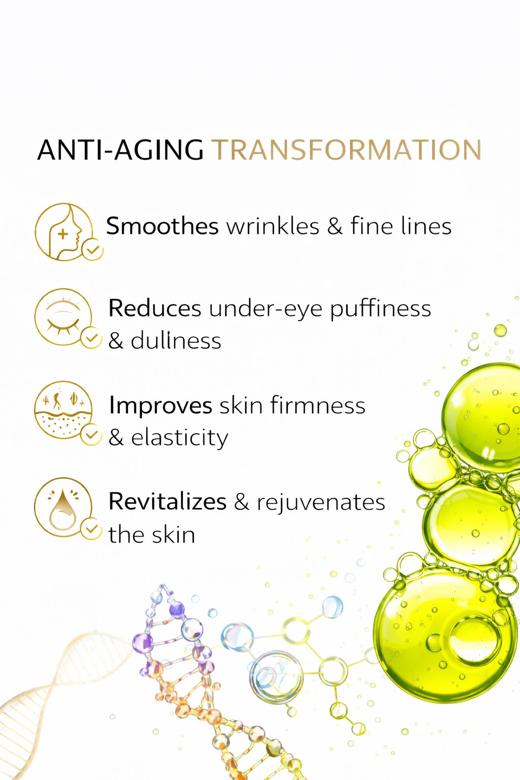 This serum is made to help your skin look younger and healthier. With regular use, skin looks smoother and softer. Fine lines and wrinkles appear less visible. The skin under the eyes looks less puffy and brighter. It helps the skin feel firmer and more lifted. It also adds moisture, so the skin looks fresh and glowing. Over time, the skin looks more even, more radiant, and more refreshed. Results may vary from person to person